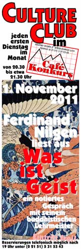 Ferdinand Nilgen liest am 1. November 2011 im Culture Club des Café Konkurs aus seinen Aufzeichnungen der philosophischen Gespräche mit seinem buddhistischen Lehtmeister: "Was ist Geist" Ferdinand Nilgen, Energieanlagen-Elektroniker