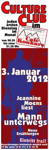 Cultere Club Lesung: Jeaninne Moens liest "Mann unterwegs", 3. Januar 2012 Cultere Club Lesung: Jeaninne Moens liest "Mann unterwegs", 3. Januar 2012 Cultere Club Lesung: Jeaninne Moens liest "Mann unterwegs", 3. Januar 2012 Cultere Club Lesung: Jeaninne Moens liest "Mann unterwegs", 3. Januar 2012 Cultere Club Lesung: Jeaninne Moens liest "Mann unterwegs", 3. Januar 2012 Cultere Club Lesung: Jeaninne Moens liest "Mann unterwegs", 3. Januar 2012 Cultere Club Lesung: Jeaninne Moens liest "Mann unterwegs", 3. Januar 2012